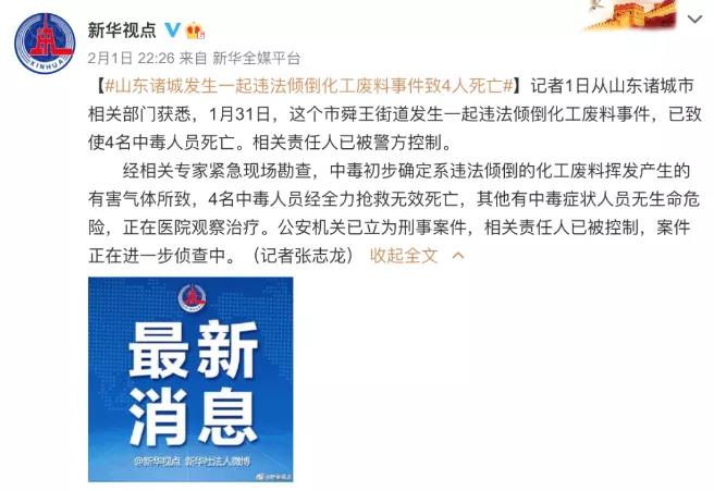 據(jù)@新華視點(diǎn)報(bào)道,1月31日,山東諸城市舜王街道發(fā)生一起違法傾倒化工廢料事件,已致使4名中毒人員死亡。相關(guān)責(zé)任人已被警方控制。 經(jīng)相關(guān)專(zhuān)家緊急現(xiàn)場(chǎng)勘查,中毒初步確定系違法傾倒的化工廢料揮發(fā)產(chǎn)生的有害氣體所致,4名中毒人員經(jīng)全力搶救無(wú)效死亡,其他有中毒癥狀人員無(wú)生命危險(xiǎn),正在醫(yī)院觀察治療。公安機(jī)關(guān)已立為刑事案件,相關(guān)責(zé)任人已被控制,案件正在進(jìn)一步偵查中。 我國(guó)是一個(gè)化工產(chǎn)品需求大國(guó),化工產(chǎn)品的產(chǎn)量一直處于高位,并且成為出口大國(guó)。但是,化工廢料的出路一直未能得到很好解決,一些農(nóng)村地區(qū)成為傾倒化工廢料的場(chǎng)所,不僅造成了空氣、水、土壤的嚴(yán)重污染,而且對(duì)人體健康也產(chǎn)生了直接的危害。 在近年來(lái)展開(kāi)的經(jīng)濟(jì)轉(zhuǎn)型中,特別是中央提出建立環(huán)境友好型社會(huì)的目標(biāo)以后,化工企業(yè)成為治理整頓的一個(gè)重點(diǎn)目標(biāo),廢料傾倒的規(guī)范也提上日程。 盡管如此,由傾倒化工廢料而引起的環(huán)境污染事件,近年來(lái)仍時(shí)有所聞,事件的經(jīng)過(guò)大都是企業(yè)將廢料偷偷運(yùn)到農(nóng)村或偏僻地區(qū),其背后是一些化工企業(yè)目無(wú)法律、為一己方便而嫁污于人的卑劣心態(tài)。 近幾年,隨著經(jīng)濟(jì)轉(zhuǎn)型的推進(jìn),全國(guó)上下對(duì)于建設(shè)環(huán)境友好型社會(huì)已有明確的共識(shí)。今年國(guó)家新組建生態(tài)環(huán)境部,對(duì)環(huán)境污染有了更嚴(yán)格的治理,對(duì)隨意傾倒化工廢料等惡劣行為,法律一定不會(huì)姑息。 懲治犯罪人員有法可依,但要把他們?cè)斐傻膰?yán)重污染清除掉,卻需要付出巨大的代價(jià)。在江蘇泰興違法傾倒危險(xiǎn)廢料事件中,當(dāng)?shù)氐耐恋乇緛?lái)呈現(xiàn)為自然的土黃色,傾倒廢料后土地呈現(xiàn)為黑色,甚至50厘米之下的土壤仍然是黑色,可見(jiàn)污染何等嚴(yán)重。很顯然,要讓這一片土地恢復(fù)生態(tài)原貌,投入的經(jīng)濟(jì)成本將是巨大的,當(dāng)?shù)卮迕駷榇烁冻龅慕】荡鷥r(jià)更是難以估量。 面對(duì)頻頻發(fā)生的化工廢料違法傾倒事件,法律之劍自然必須高懸,但同時(shí)也要看到,中國(guó)是化工生產(chǎn)大國(guó),需要給化工廢料提供出路。在改革開(kāi)放初期,原來(lái)在城區(qū)的化工企業(yè)大量搬遷到農(nóng)村地區(qū),在經(jīng)濟(jì)利益驅(qū)使之下,這甚至成為一些農(nóng)村地區(qū)搞活經(jīng)濟(jì)的一個(gè)途徑。 如今,廣大農(nóng)村地區(qū)意識(shí)到了化工廢料的危害,開(kāi)始拒絕接受傾倒,企業(yè)只能尋求更遠(yuǎn)的地方作為傾倒場(chǎng)所。然而,這種做法只是將問(wèn)題不斷地往后推,并不能從根子上解決問(wèn)題。一段時(shí)間以來(lái),政府部門(mén)對(duì)一些不符合條件的化工企業(yè)實(shí)行了關(guān)停,這又會(huì)導(dǎo)致就業(yè)受到影響,因此也缺乏大范圍推廣的價(jià)值。