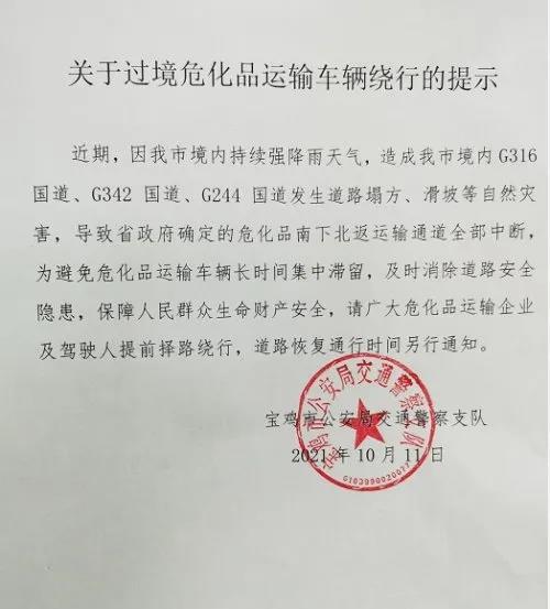 近期,因?qū)氹u市境內(nèi)持續(xù)強降雨天氣,造成寶雞市境內(nèi)G316國道、G342國道、G244國道發(fā)生道路塌方、滑坡等自然災(zāi)害,導(dǎo)致省政府確定的危化品南下北返運輸通道全部中斷,為避免;愤\輸車輛長時間集中滯留,及時消除道路安全隱患,保障人民群眾生命財產(chǎn)安全。 請廣大;愤\輸企業(yè)及駕駛?cè)颂崆皳衤防@行,道路恢復(fù)通行時間另行通知。 陜西其他限行措施: G85銀昆高速寶雞南互通立交至田壩樞紐立交段限行 為進一步加強;返缆愤\輸安全管理,防范化解交通安全風(fēng)險隱患,保障人民群眾生命、財產(chǎn)安全,全力預(yù)防;愤\輸車輛道路交通事故,依據(jù)《中華人民道路交通安全法》《危險貨物道路運輸安全管理辦法》等有關(guān)法律、行政法規(guī)。結(jié)合道路實際,經(jīng)研究決定,禁止;愤\輸車輛通行G85銀昆高速寶雞南互通立交(K601+000)至田壩樞紐立交(K649+100)段道路(隧道群),F(xiàn)將有關(guān)事項通告如下: 一、限行車輛 ;愤\輸車輛。 二、限行路段 G85銀昆高速寶雞南互通立交(K601+000)至田壩樞紐立交(K649+100)段道路。 三、限行時間 10月8日起全天24小時禁止;愤\輸車輛通行。 四、繞行路線 (一)連霍高速甘肅天水和楊凌方向及G85銀昆高速平?jīng)龇较騺碥,?jīng)潘家灣樞紐立交駛?cè)隚85銀昆高速至寶雞南出口駛出,經(jīng)高速公路引線駛?cè)隨219省道。 (二)漢中方向來車,經(jīng)G244國道潘太公路通行、禁止駛?cè)隚85銀昆高速。 (三)過境;愤\輸車輛嚴(yán)禁駛?cè)雽氹u市區(qū)道路。 陜西殘?zhí)貖W會期間限行 殘?zhí)貖W會賽事期間對陜西省境內(nèi);愤\輸車輛實施交通管制,具體通告如下: 劇毒化學(xué)品車輛 2021年10月18日00:00——30日24:00 全省境內(nèi)禁止劇毒化學(xué)品運輸車輛通行。 危化品運輸車輛 2021年10月20日00:00——24日24:00 2021年10月27日00:00——30日24:00 全省境內(nèi)禁止;愤\輸車輛通行。