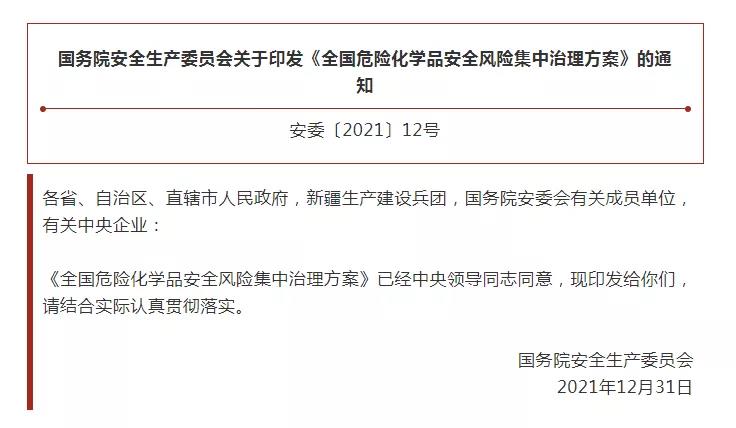 全國危險化學品安全風險集中治理方案 危險化學品涉及行業(yè)領域廣、鏈條長,安全風險大、治理任務重。黨中央、國務院高度重視,習近平總書記多次作出重要批示,最近又專門作出重要指示。為認真抓好貫徹落實,有效防范化解危險化學品重大安全風險,保障人民群眾生命財產(chǎn)安全和社會穩(wěn)定,按照黨中央、國務院領導同志批示要求,結(jié)合深入貫徹落實中共中央辦公廳、國務院辦公廳《關于全面加強危險化學品安全生產(chǎn)工作的意見》(以下簡稱兩辦《意見》)和國務院安委會《全國安全生產(chǎn)專項整治三年行動計劃》(以下簡稱《三年行動計劃》),制定本方案。 一、總體要求 以習近平新時代中國特色社會主義思想為指導,深入貫徹習近平總書記關于安全生產(chǎn)重要論述,堅持人民至上、生命至上,強化底線思維和紅線意識,統(tǒng)籌好發(fā)展和安全,深入分析研判、緊緊扭住抓牢貫徹落實兩辦《意見》和《三年行動計劃》過程中發(fā)現(xiàn)的突出矛盾以及國內(nèi)外典型事故暴露出的重大風險隱患,全面調(diào)動各方力量,利用一年時間集中治理,進一步推動各地區(qū)、各有關部門和單位樹牢安全發(fā)展理念,加大安全投入,壓實安全責任,堅持嚴格監(jiān)管執(zhí)法與強化信息技術(shù)支撐并重,完善危險化學品安全風險防范化解工作機制,務必做到重大風險隱患排查見底、防范治理措施落實到位,真正從根本上消除事故隱患、從根本上解決問題,切實把確保人民生命安全放在第一位落到實處,堅決防范遏制危險化學品重特大事故,為迎接黨的二十大勝利召開營造安全穩(wěn)定環(huán)境。 二、重點治理的突出問題和重大安全風險 各地區(qū)、各有關部門和單位要認真梳理兩辦《意見》和《三年行動計劃》重點任務落實情況,深刻吸取典型事故教訓,采取有針對性措施,對照以下兩大類突出問題和四個環(huán)節(jié)的重大安全風險進行重點排查。 (一)安全發(fā)展理念不牢問題。一是學習貫徹習近平總書記關于安全生產(chǎn)重要論述不深入不扎實,沒有分析研判本地區(qū)危險化學品重大安全風險,對新情況、新問題不了解、不掌握。二是沒有統(tǒng)籌好發(fā)展和安全兩件大事,只重發(fā)展不顧安全,在不具備條件的情況下盲目發(fā)展高危工藝的化工項目,淘汰落后生產(chǎn)能力、推動化工產(chǎn)業(yè)升級措施不力、進展遲緩。三是源頭治理不嚴不實,化工產(chǎn)業(yè)轉(zhuǎn)移安全風險在一些地區(qū)加速集聚,風險管控能力不足,導致事故多發(fā),近一年全國發(fā)生的12起化工較大事故中有7起發(fā)生在異地轉(zhuǎn)移企業(yè)。一些地區(qū)沒有對危險化學品企業(yè)全面開展安全分類整治,非法違法“小化工”整治不認真不徹底。四是安全投入不足,一些地區(qū)涉及“兩重點一重大”(重點監(jiān)管的危險化工工藝、重點監(jiān)管的危險化學品和危險化學品重大危險源)的化工企業(yè)沒有按期完成泄漏檢測報警、緊急切斷、自動化控制和安全儀表系統(tǒng)的裝備使用,自動消防設施功能失靈,消防基礎設施設備及管道老化。五是應急處置力量不足,部分大型企業(yè)未按要求建設企業(yè)專職消防隊,部分企業(yè)沒有建設相關工藝處置隊和應急處置隊。 (二)安全生產(chǎn)責任不落實問題。一是安全監(jiān)管執(zhí)法力量薄弱,一些危險化學品重點地區(qū)沒有按照兩辦《意見》要求配齊配強專業(yè)執(zhí)法力量,危險化學品安全監(jiān)管執(zhí)法人員中具有相關專業(yè)學歷、職業(yè)資格和實踐經(jīng)驗的不到三分之一,不懂不會的問題沒有得到根本改變。二是按照“三個必須”要求已經(jīng)明確的部門安全監(jiān)管責任落實不到位,甚至有的將自身的業(yè)務工作與安全割裂開來,安全風險因素考慮不足,導致漏管失控。三是一些企業(yè)安全生產(chǎn)和消防安全主體責任不落實,風險辨識和管控制度執(zhí)行不嚴,未按規(guī)定配備化工專業(yè)技術(shù)團隊、高風險崗位操作人員和消防控制室值班人員,安全責任落實不到基層班組,一些重大危險源包保責任人只掛名不履職,一些消防控制室值班人員未取得自動消防設施操作員證。四是信息化監(jiān)控手段嚴重滯后,一些化工園區(qū)和企業(yè)對重大危險源、重點場所、基礎設施等沒有建立完善的安全風險在線監(jiān)測預警系統(tǒng),相關部門之間存在數(shù)據(jù)壁壘和信息孤島,尚未建立貫通危險化學品全生命周期的信息化系統(tǒng),更未實現(xiàn)區(qū)域聯(lián)網(wǎng)。 (三)生產(chǎn)儲存環(huán)節(jié)重大安全風險。一是一些精細化工企業(yè)沒有按要求開展反應安全風險評估,部分涉及高危工藝的生產(chǎn)裝置未實現(xiàn)全流程自動化控制,操作人員專業(yè)能力資質(zhì)不達標。二是高危工藝和特別管控危險化學品企業(yè)安全設計水平低,風險隱患排查治理不徹底,常態(tài)化風險管控機制缺失。三是一些化工企業(yè)老舊裝置數(shù)量多,壓力容器管道安全風險增大,預防性維護和常態(tài)化監(jiān)測監(jiān)控措施跟不上,腐蝕泄漏風險增大。四是一些地方化學品儲罐區(qū)缺乏科學規(guī)劃,企業(yè)無證儲存、超許可范圍儲存、邊建設邊儲存,安全設施與消防應急設施不完善;一些地方化工儲存設施分布廣