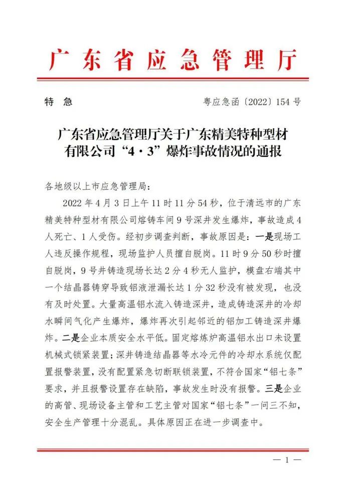 4月3日上午,廣東清遠(yuǎn)某特種型材有限公司熔鑄二號(hào)車間9號(hào)鑄造井發(fā)生爆炸事故。事故造成4人死亡、1人重傷,廠房嚴(yán)重?fù)p毀。 監(jiān)控視頻顯示,爆炸現(xiàn)場(chǎng)升起數(shù)米高的“蘑菇云”。 4月5日,清遠(yuǎn)市清城區(qū)應(yīng)急管理局通報(bào),經(jīng)現(xiàn)場(chǎng)初步判斷,直接原因?yàn)椋轰X棒在拉鑄過(guò)程中,鋁水泄漏到冷卻水池內(nèi)導(dǎo)致事故發(fā)生。 事故通報(bào)顯示,具體事故原因初步總結(jié)為: 一是現(xiàn)場(chǎng)工人違反操作規(guī)程,現(xiàn)場(chǎng)監(jiān)護(hù)人員擅自脫崗。 二是企業(yè)本質(zhì)安全水平低。 三是企業(yè)的高管、現(xiàn)場(chǎng)設(shè)備主管和工藝主管對(duì)國(guó)家“鋁七條”一問(wèn)三不知,安全生產(chǎn)管理十分混亂。 有關(guān)善后工作正在進(jìn)行中,清遠(yuǎn)已成立事故調(diào)查組,正開展事故調(diào)查處理工作。