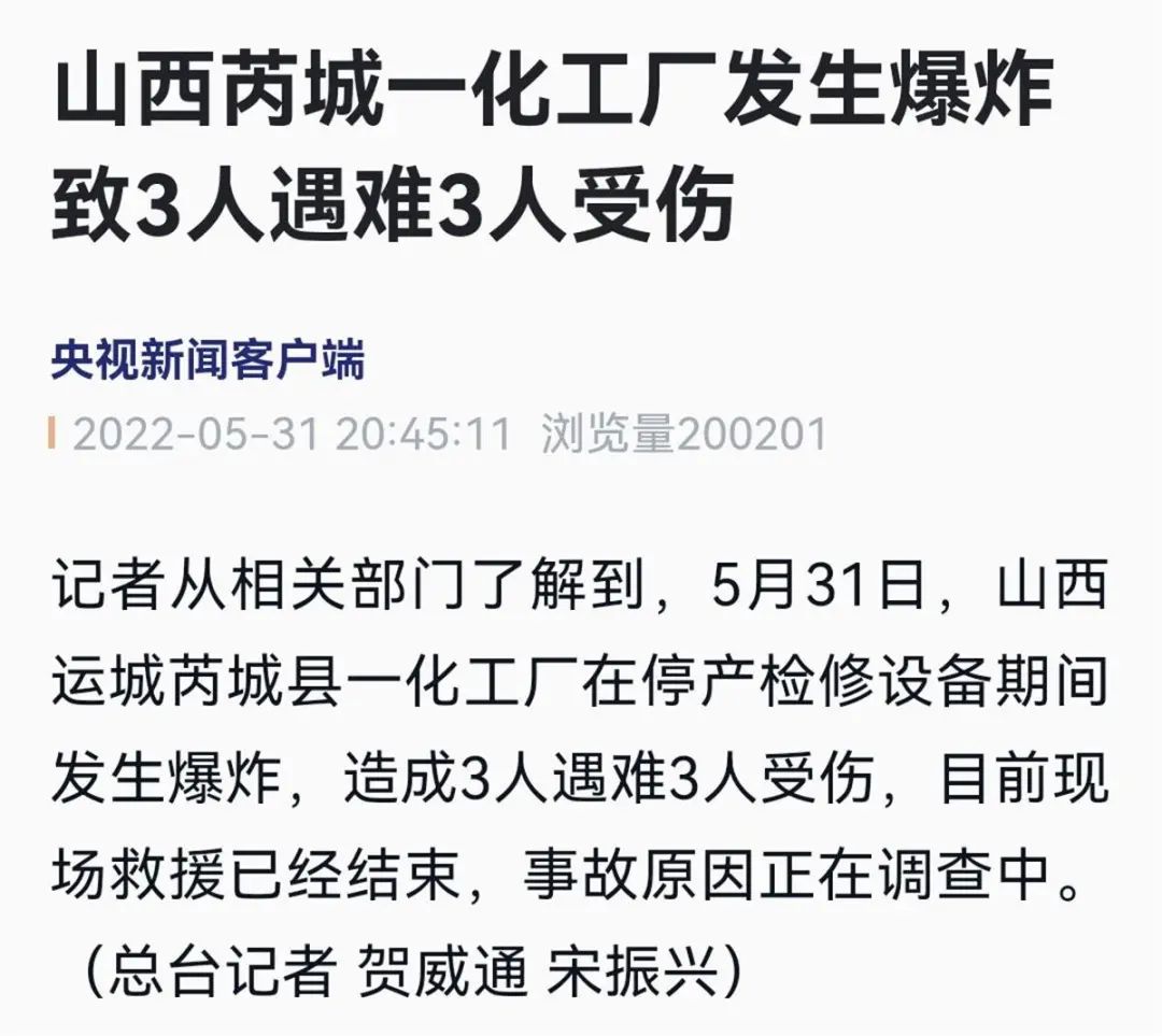 2022年5月31日,山西運(yùn)城芮城縣一化工廠在停產(chǎn)檢修設(shè)備期間發(fā)生爆炸,造成3人遇難3人受傷。 ▲來(lái)源:央視新聞客戶端 事故發(fā)生在芮城縣工業(yè)東街附近,周邊一工廠員工稱(chēng),事發(fā)時(shí)間為下午2點(diǎn)多,爆炸的聲音特別大。他3點(diǎn)多出門(mén)時(shí),看到工業(yè)東街附近被封鎖起來(lái),有工作人員駐守,消防也在現(xiàn)場(chǎng)。 事發(fā)地300米外一家賓館的房客稱(chēng),事發(fā)時(shí)她還在房間休息,突然被一聲巨響驚醒,誤以為是地震。透過(guò)窗戶,他遠(yuǎn)遠(yuǎn)看見(jiàn)附近工廠在冒煙,仔細(xì)一看窗戶玻璃上有裂紋。 目前現(xiàn)場(chǎng)救援已經(jīng)結(jié)束,事故原因正在調(diào)查中,請(qǐng)繼續(xù)關(guān)注官方報(bào)道。