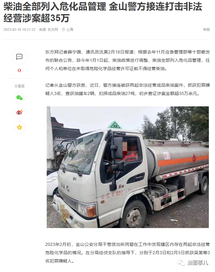 案例一:近日,長(zhǎng)沙市天心區(qū)應(yīng)急管理局接到群眾舉報(bào),在暮云街道蓮河村蓮河加油站正后面100米處一板房?jī)?nèi),儲(chǔ)存了危險(xiǎn)化學(xué)品。該局立即聯(lián)合組織公安、街道等部門上門核實(shí),發(fā)現(xiàn)龔某某為節(jié)約成本,在自建板房油罐內(nèi)儲(chǔ)存2.88噸柴油,供自家車隊(duì)使用。臨邊就是中石化蓮河加油站,一旦出現(xiàn)泄漏事故,易造成人員傷害和環(huán)境傷害,存在重大的安全隱患。天心區(qū)應(yīng)急管理局當(dāng)即對(duì)危險(xiǎn)化學(xué)品進(jìn)行了扣押,消除安全隱患。 目前,天心區(qū)應(yīng)急管理局已經(jīng)對(duì)龔某某立案調(diào)查,龔某某未將危險(xiǎn)化學(xué)品儲(chǔ)存在專用倉(cāng)庫(kù)內(nèi),違反了《危險(xiǎn)化學(xué)品安全管理?xiàng)l例》相關(guān)規(guī)定,執(zhí)法人員依據(jù)《危險(xiǎn)化學(xué)品安全管理?xiàng)l例》和《安全生產(chǎn)行政執(zhí)法與刑事司法銜接工作辦法》(應(yīng)急〔2019〕54 號(hào))相關(guān)規(guī)定,對(duì)龔某某作出罰款60000元的行政處罰,并移交公安部門進(jìn)行行刑銜接。 案例二:3月3日下午,根據(jù)群眾舉報(bào),長(zhǎng)沙市開(kāi)福區(qū)應(yīng)急管理局聯(lián)合青竹湖街道對(duì)湖南某公司開(kāi)展危險(xiǎn)化學(xué)品“打非治違”執(zhí)法檢查行動(dòng)。該公司位于新港路80號(hào),現(xiàn)場(chǎng)設(shè)置了地下儲(chǔ)油罐1個(gè)、加油機(jī)1臺(tái)。公司負(fù)責(zé)人表示,儲(chǔ)罐內(nèi)儲(chǔ)存的0號(hào)車用柴油主要用于公司內(nèi)部車輛加油使用。執(zhí)法人員檢查發(fā)現(xiàn)地下儲(chǔ)罐全部浸泡水中,銹蝕嚴(yán)重,且未采取任何安全防范措施,存在巨大安全隱患。 該公司涉嫌違反《危險(xiǎn)化學(xué)品安全管理?xiàng)l例》第二十四條第一款“危險(xiǎn)化學(xué)品應(yīng)當(dāng)儲(chǔ)存在專用倉(cāng)庫(kù)、專用場(chǎng)地或者專用儲(chǔ)存室(以下統(tǒng) 稱專用倉(cāng)庫(kù))內(nèi),并由專人負(fù)責(zé)管理的規(guī)定”。執(zhí)法人員依法對(duì)該地下儲(chǔ)油罐進(jìn)行查封,扣押柴油4.6噸。目前案件正在進(jìn)一步調(diào)查中。2023年1月1日起,所有柴油列為《危險(xiǎn)化學(xué)品目錄》,不再區(qū)分閃點(diǎn)。為打好安全生產(chǎn)攻堅(jiān)仗,開(kāi)福區(qū);療熁üべQ(mào)專委會(huì)深入推進(jìn)柴油專項(xiàng)整治工作,組織各街道、各部門全面摸排,特別是物流運(yùn)輸企業(yè)、渣土公司、攪拌站、建設(shè)工地、廢鐵站等用油量較大的單位,嚴(yán)禁違規(guī)設(shè)置露天罐、埋地罐等非法儲(chǔ)油設(shè)施;交警、交通部門將加大對(duì)非法改裝廂式貨車、面包車非法運(yùn)輸柴油的打擊力度;公安機(jī)關(guān)積極配合辦理行刑銜接案件。 案例三:2023年2月初,上海金山公安分局干巷派出所民警在工作中發(fā)現(xiàn)轄區(qū)內(nèi)存在兩起非法經(jīng)營(yíng)危險(xiǎn)化學(xué)品的情況。在分局經(jīng)偵支隊(duì)的指導(dǎo)下,分別于2月3日和2月5日抓獲吳某等3名犯罪嫌疑人。經(jīng)查,犯罪嫌疑人吳某等3人在已申報(bào)但還未取得危險(xiǎn)化學(xué)品經(jīng)營(yíng)許可證的情況下,長(zhǎng)期從事柴油銷售,他們從正規(guī)渠道以“批發(fā)價(jià)”購(gòu)入柴油,銷售的柴油主要用于工地施工設(shè)備以及農(nóng)場(chǎng)農(nóng)用機(jī)械等,至案發(fā)已非法銷售柴油50余噸,涉案金額超35萬(wàn)元。 目前,犯罪嫌疑人吳某、尹某、艾某3人因涉嫌非法經(jīng)營(yíng)罪被公安機(jī)關(guān)依法采取刑事強(qiáng)制措施,案件正在進(jìn)一步審理中。根據(jù)網(wǎng)絡(luò)上的政策解讀,柴油全部列入;饭芾砗,將嚴(yán)厲打擊一些個(gè)人或企業(yè)利用內(nèi)部自用加油站的名義(比如物流公司內(nèi)部車輛加油)來(lái)打擦邊球進(jìn)行柴油對(duì)外經(jīng)營(yíng)或貿(mào)易的行為,柴油納入;饭芾砗,若無(wú)證經(jīng)營(yíng)或儲(chǔ)存,將面臨刑法的危險(xiǎn)作業(yè)罪、非法經(jīng)營(yíng)罪的責(zé)任追究。此外,按照治安管理處罰法相關(guān)要求,對(duì)加油站對(duì)外銷售打桶或散裝柴油有可能更加嚴(yán)格,對(duì)于偷盜柴油的行為,處罰會(huì)更加嚴(yán)重。 ;方榻B 2022年11月7日,應(yīng)急管理部等10部門發(fā)布關(guān)于調(diào)整《危險(xiǎn)化學(xué)品目錄(2015版)》的公告,將“1674柴油[閉杯閃點(diǎn)≤60℃]”調(diào)整為“1674柴油”,新規(guī)于2023年1月1日起施行。危險(xiǎn)化學(xué)品,是指具有毒害、腐蝕、爆炸、燃燒、助燃等性質(zhì),對(duì)人體、設(shè)施、環(huán)境具有危害的劇毒化學(xué)品和其他化學(xué)品。一旦儲(chǔ)存運(yùn)輸不當(dāng),將會(huì)嚴(yán)重危害影響人民的生命安全和環(huán)境安全。危險(xiǎn)化學(xué)品對(duì)于儲(chǔ)存場(chǎng)地有特殊的要求,應(yīng)與其他貨物分開(kāi)儲(chǔ)存,儲(chǔ)存在專用倉(cāng)庫(kù)內(nèi),并有專人負(fù)責(zé)管理。 溫馨提醒 企業(yè)在儲(chǔ)存和使用危險(xiǎn)化學(xué)品時(shí),要對(duì)危險(xiǎn)化學(xué)品進(jìn)行管理,采取安全措施。危險(xiǎn)化學(xué)品必須存放到專用倉(cāng)庫(kù),倉(cāng)庫(kù)應(yīng)建在企業(yè)單位區(qū)域邊緣且保證有安全