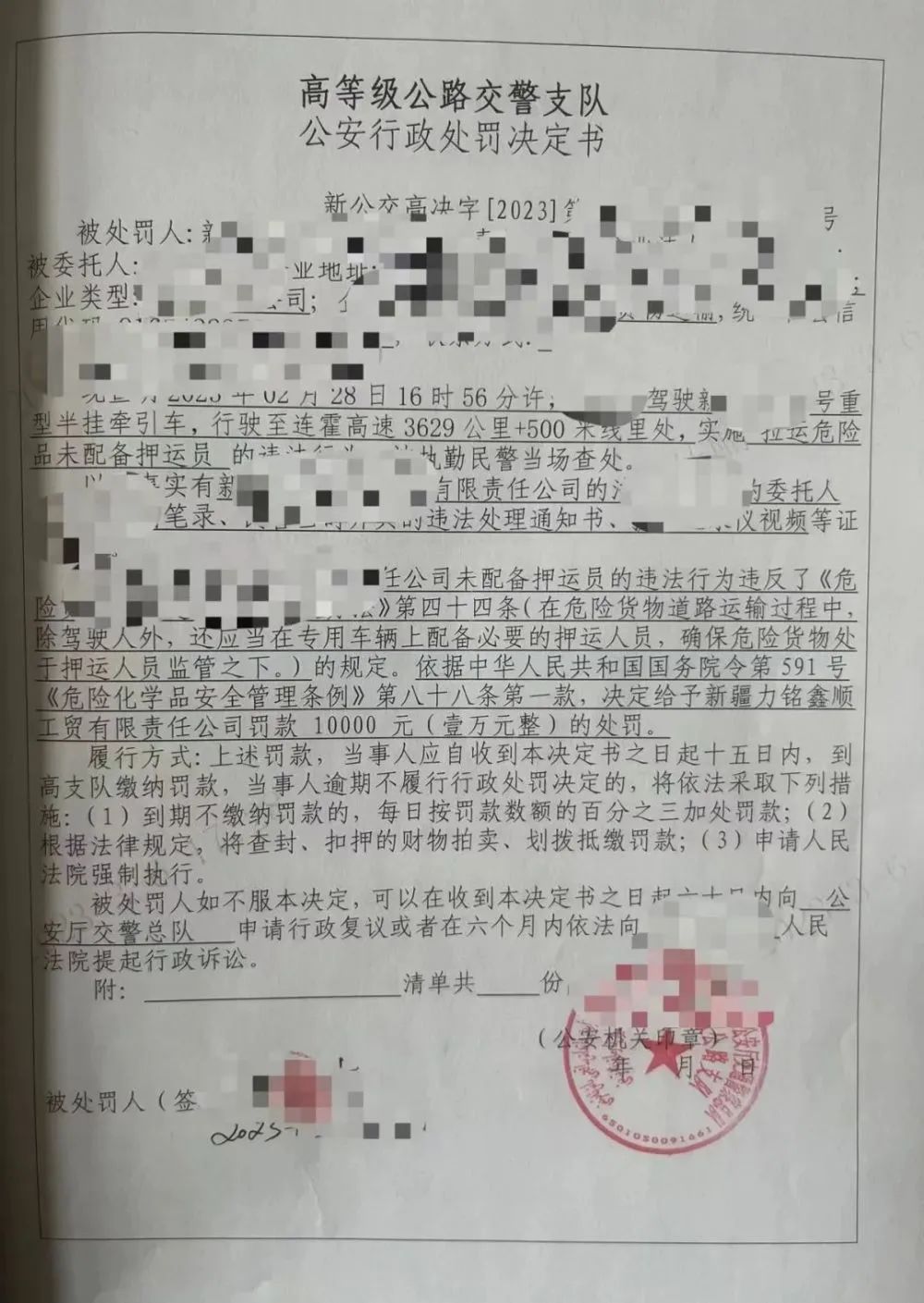 3月6日下午,新疆公安廳交警總隊(duì)高等級(jí)公路支隊(duì)烏西大隊(duì)違法處理室內(nèi),新疆力銘鑫順工貿(mào)有限責(zé)任公司的委托人鄔某正在代表該公司處理違法行為,仔細(xì)一看行政處罰決定書(shū)上的罰款居然高達(dá)一萬(wàn)元,不禁讓人感到好奇,到底是什么違法行為罰款金額如此之高? 原來(lái),2023年2月28日17時(shí)許,高支隊(duì)烏西大隊(duì)民警在轄區(qū)G30連霍高速頭屯河收費(fèi)站開(kāi)展春節(jié)守護(hù)行動(dòng)“兩客一!睓z查登記時(shí),在對(duì)一輛新G牌照的危化品運(yùn)輸車檢查過(guò)程中,發(fā)現(xiàn)該車駕駛室僅有一人,無(wú)危化品車輛押運(yùn)員隨車押運(yùn),就在民警詢問(wèn)過(guò)程中,又一輛新G牌照的;奋囻倎(lái),經(jīng)檢查發(fā)現(xiàn)此車同樣未配備押運(yùn)人員。 經(jīng)核實(shí),兩車均系新疆力銘鑫順工貿(mào)有限責(zé)任公司名下車輛,據(jù)兩名駕駛?cè)嗣枋,因公司未配備押運(yùn)員,自己也沒(méi)有多問(wèn),想著應(yīng)該沒(méi)事,沒(méi)想到會(huì)被交警查到。民警對(duì)兩名駕駛?cè)诉M(jìn)行了嚴(yán)厲的批評(píng)教育,分別開(kāi)具了違法處理通知書(shū),并要求所屬公司負(fù)責(zé)人到大隊(duì)接受處理。 于是這才有了開(kāi)頭的一幕,通過(guò)詢問(wèn)鄔某得知,兩車?yán)\(yùn)的均為液化天然氣從烏魯木齊市前往獨(dú)山子,由于公司培訓(xùn)的押運(yùn)員沒(méi)有達(dá)到上崗要求,尚未取得;费哼\(yùn)從業(yè)資格證,所以沒(méi)有配備押運(yùn)員。 根據(jù)《危險(xiǎn)貨物道路運(yùn)輸管理辦法》第四十四條相關(guān)規(guī)定,在危險(xiǎn)貨物道路運(yùn)輸過(guò)程中,除駕駛?cè)送猓應(yīng)當(dāng)在專用車輛上配備必要的押運(yùn)人員,確保危險(xiǎn)貨物處于押運(yùn)人員的監(jiān)管之下的規(guī)定,民警依法對(duì)該公司名下的兩車駕駛?cè)藢?shí)施通過(guò)道路運(yùn)輸危險(xiǎn)化學(xué)品不配備押運(yùn)人員的違法行為分別處以罰款一萬(wàn)元的處罰,合計(jì)罰款共兩萬(wàn)元。 高速交警提示 運(yùn)載;奋囕v要嚴(yán)格遵守運(yùn)輸要求,取得;愤\(yùn)載資質(zhì),司機(jī)要有;愤\(yùn)輸從業(yè)資質(zhì),且要隨車配備有相應(yīng)資質(zhì)的押運(yùn)員。若車輛在行駛途中出現(xiàn)危化品泄漏等緊急情況,押運(yùn)員可以做出應(yīng)急措施。危化品運(yùn)輸押運(yùn)人員對(duì);愤\(yùn)輸進(jìn)行全程監(jiān)督,對(duì)行車安全起到了至關(guān)重要的作用,相關(guān)從業(yè)人員和企業(yè)務(wù)必重視!