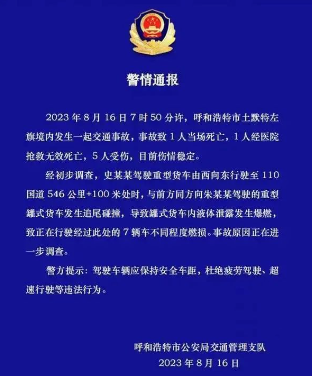 8月16日,呼和浩特市土默特左旗一輛重型;饭捃嚺c多車相撞,發(fā)生爆燃,事故造成2人死亡,5人受傷。 視頻顯示,至少有三輛大車并排停在公路上,車身起火冒起濃煙,路牌顯示事故地點(diǎn)距離賈力更故居15公里。拍攝者身處一片草叢中,遠(yuǎn)處火焰熊熊燃燒,黑煙漫天,同時(shí)傳出爆炸聲響。 據(jù)@平安青城通報(bào):8月16日7時(shí)50 分許,呼和浩特市土默特左旗境內(nèi)發(fā)生一起交通事故,事故致1人當(dāng)場死亡,1人經(jīng)醫(yī)院搶救無效死亡,5人受傷,目前傷情穩(wěn)定。 經(jīng)初步調(diào)查,史某某駕駛重型貨車由西向東行駛至110國道 546 公里+100 米處時(shí),與前方同方向朱某某駕駛的重型罐式貨車發(fā)生追尾碰撞,導(dǎo)致罐式貨車內(nèi)液體泄漏發(fā)生爆燃致正在行駛經(jīng)過此處的7輛車不同程度燃損。事故原因正在進(jìn)一步調(diào)查。