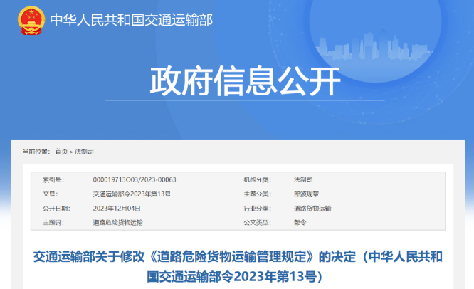 近日,國務(wù)院發(fā)布《關(guān)于修改和廢止部分行政法規(guī)的決定》(國務(wù)院令第764號,以下簡稱《決定》),對《中華人民共和國道路運輸條例》作出修改。 為落實《決定》要求,交通運輸部對《道路危險貨物運輸管理規(guī)定》進行了相應(yīng)修改,取消了“對道路危險貨物運輸企業(yè)或者單位不按照規(guī)定隨車攜帶道路運輸證行為的罰款”。 此外,依據(jù)國家機構(gòu)改革部署,對部分機構(gòu)名稱進行了相應(yīng)修改;依據(jù)近兩年新頒布實施的《中華人民共和國安全生產(chǎn)法》,對處罰規(guī)定進行了梳理和調(diào)整,以與上位法保持一致;根據(jù)近兩年標(biāo)準(zhǔn)修改、廢止情況,對引用的標(biāo)準(zhǔn)名稱進行了相應(yīng)更新。 詳情如下: 一、將第三條中的“《危險貨物品名表》(GB 12268)”、第四條中的“《危險貨物分類和品名編號》(GB 6944)”“《危險貨物品名表》(GB 12268)”“《危險貨物運輸包裝通用技術(shù)條件》(GB 12463)”修改為“《危險貨物道路運輸規(guī)則》(JT/T 617)”。 二、將第七條第二款修改為:“縣級以上地方人民政府交通運輸主管部門(以下簡稱交通運輸主管部門)負責(zé)本行政區(qū)域的道路危險貨物運輸管理工作”;刪去第三款。 三、將第九條、第十一條中的“安全生產(chǎn)監(jiān)督管理部門”修改為“應(yīng)急管理部門”。 四、將第十條中的“工商行政管理機關(guān)”修改為“市場監(jiān)督管理部門”。 五、刪去第八條第一項第6目中的“質(zhì)量檢驗部門”、第二十三條、第二十四條第三款中的“質(zhì)量檢驗部門出具的”。 六、將第三十六條、第四十四條中的“《汽車運輸危險貨物規(guī)則》(JT 617)”“《汽車運輸、裝卸危險貨物作業(yè)規(guī)程》(JT 618)”修改為“《危險貨物道路運輸規(guī)則》(JT/T 617)”。 七、第四十八條改為第四十七條,將其中的“安全生產(chǎn)監(jiān)督管理部門和環(huán)境保護、衛(wèi)生主管部門”修改為“應(yīng)急管理部門和生態(tài)環(huán)境、衛(wèi)生健康主管部門”。 八、第五十六條改為第五十五條,將其中的“有違法所得的”修改為“違法所得超過2萬元的”。 九、刪去第五十九條。 十、第六十一條改為第五十九條,修改為:“違反本規(guī)定,道路危險貨物運輸企業(yè)或者單位未配備專職安全管理人員的,由交通運輸主管部門依照《中華人民共和國安全生產(chǎn)法》的規(guī)定進行處罰! 十一、將“道路運輸管理機構(gòu)”“道路危險貨物運輸管理機構(gòu)”“縣級以上道路運輸管理機構(gòu)”統(tǒng)一修改為“交通運輸主管部門”。 條文序號和個別文字作相應(yīng)修改。 本決定自公布之日起施行。 《道路危險貨物運輸管理規(guī)定》根據(jù)本決定作相應(yīng)修正,重新公布。