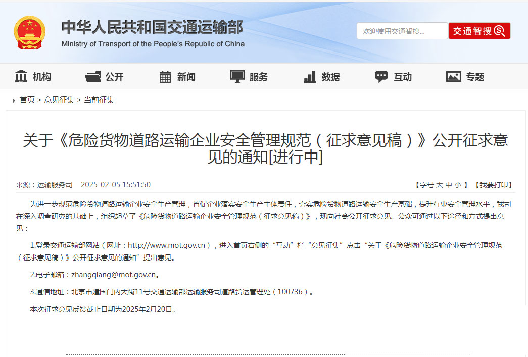 為進一步規(guī)范危險貨物道路運輸企業(yè)安全生產(chǎn)管理,督促企業(yè)落實安全生產(chǎn)主體責任,夯實危險貨物道路運輸安全生產(chǎn)基礎,提升行業(yè)安全管理水平,近日,交通運輸部運輸服務司在深入調查研究的基礎上,組織起草了《危險貨物道路運輸企業(yè)安全管理規(guī)范(征求意見稿)》,現(xiàn)向社會公開征求意見。根據(jù)當前危險貨物道路運輸企業(yè)管理暴露出的一些問題和短板,交通運輸部借鑒浙江省、江蘇省、廣東省等地經(jīng)驗,制定《危險貨物道路運輸企業(yè)安全管理規(guī)范》,對于督促指導企業(yè)嚴格執(zhí)行有關法律法規(guī)和標準規(guī)范,落實安全生產(chǎn)主體責任,實現(xiàn)“管理有規(guī)范、作業(yè)有標準、操作有程序、過程有記錄、結果有考核”,防范化解重大風險、遏制重特大事故發(fā)生具有重要意義。圍繞安全問題,新規(guī)在多方面進行了明確的規(guī)定,如在貨物運輸裝卸貨上,規(guī)定駕駛員和押運人員不得違反規(guī)定擅自從事卸貨作業(yè)活動,杜絕因不當造作引發(fā)安全問題。對于危貨電子運單,新規(guī)也做出了明確規(guī)定,強調電子運單的規(guī)范制作性,如駕駛員和押運員信息必須與電子運單保持一致,貨物信息填寫必須準確,避免有軌跡無運單等等。在監(jiān)管方面,規(guī)定危貨運輸企業(yè)應當建立具有行駛記錄、衛(wèi)星定位功能的衛(wèi)星定位裝置(以下簡稱衛(wèi)星定位裝置)安裝、使用及維護制度。危貨車輛動態(tài)監(jiān)控數(shù)據(jù)應當至少保存6個月,違法駕駛信息及處理情況應當至少保存36個月。