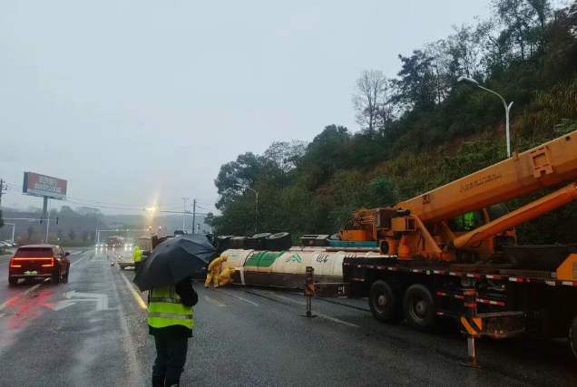 11月3日06時04分,湖南湘潭市消防救援支隊接到報警稱湘潭縣018縣道(往楊家橋收費站方向)一罐車發(fā)生側翻泄漏,車上載有濃度為32%的液堿。指揮中心立即調派金桂路站共3輛消防車、12名指戰(zhàn)員趕赴現(xiàn)場,同時聯(lián)動應急、交通、環(huán)保公安等部門協(xié)同處置。06時22分,消防救援力量抵達事故地點。 經(jīng)偵查發(fā)現(xiàn),事故車輛為一輛槽罐車,車載約33噸、濃度32%的液堿,行駛過程中發(fā)生側翻,目前罐頂入孔處出現(xiàn)少量泄漏。根據(jù)現(xiàn)場情況,帶隊指揮員立即組織力量在泄漏點設置水槍,對泄漏的液堿構筑圍堤封堵和封堵下水道,阻止泄漏的液堿進一步向外擴散,并迅速利用堵漏器材對泄漏點進行封堵。 同時,經(jīng)過現(xiàn)場指揮部及相關專家的評估決策,決定采用對罐體進行切割來輸轉倒罐的方案,進行本次事故處置。9時05分,救援人員使用自帶防爆轉料泵、軟管等裝備開始實施倒罐作業(yè)。經(jīng)過近4個小時的持續(xù)奮戰(zhàn),9時51分,救援人員成功將事故車槽罐內液堿轉移至備用槽罐,順利完成倒灌作業(yè)。經(jīng)反復檢測確認,現(xiàn)場無危險后,全體人員安全撤離。