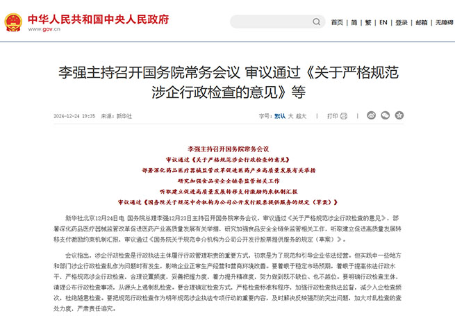 國務(wù)院總理李強12月23日主持召開國務(wù)院常務(wù)會議,審議通過《關(guān)于嚴格規(guī)范涉企行政檢查的意見》,部署深化藥品醫(yī)療器械監(jiān)管改革促進醫(yī)藥產(chǎn)業(yè)高質(zhì)量發(fā)展有關(guān)舉措,研究加強食品安全全鏈條監(jiān)管相關(guān)工作,聽取建立促進高質(zhì)量發(fā)展轉(zhuǎn)移支付激勵約束機制匯報,審議通過《國務(wù)院關(guān)于規(guī)范中介機構(gòu)為公司公開...